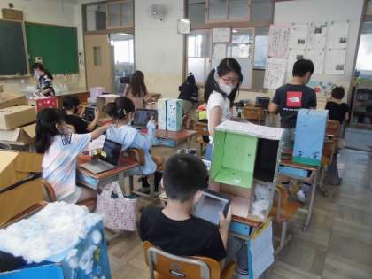4年1組は,図画工作科で,「おもしろだんボール」の作品をGIGA端末に取り入れました。タブレットを使って写真撮影をし,ロイロノートに貼り付けました。そして,それぞれの作品のよさを交流しました。