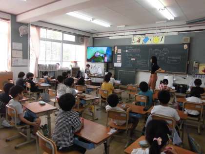 1年生は,算数科で,「たし算」の学習をしました。問題文をよく読んで,どのような式に表せばよいかを考えました。立式の後は,計算カードを活用して答えを求めました。求め方について,全体の前で説明しました。