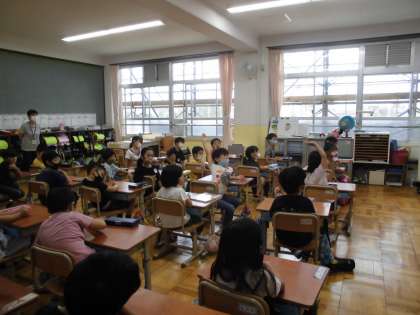 1年生は,両学級とも算数科で,「10より大きい数」のテストに挑戦しました。初めに,テストの受け方を確認しました。机を運動場の方向に向けることや隣の友だちとの距離を板目2マス分空けること,さらには,名前の書き方や提出の仕方を確かめてからスタートしました。