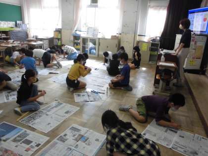 4年2組は,算数科で,新聞紙を使って1平方メートルの大きさを実際に作ってみました。一辺を100cmにして作ると,人が二人入れるぐらいの大きさになりました。新しい発見でした。