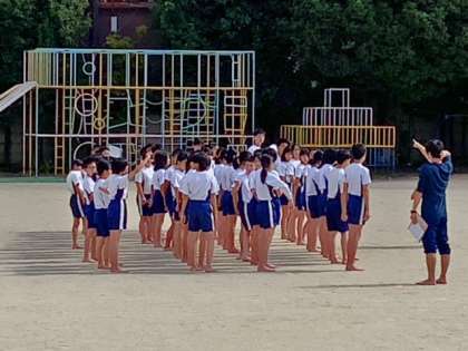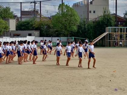 6年生は、運動場で通し練習を行いました。音楽に合わせて、しっかり動くことができました。隊形や法被を着るタイミングなども確認しました。