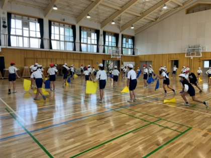 5年生は、体育館で一つ一つの動きを確かめました。旗の振り方や隊形の変化の仕方などに注意しながら進めました。
