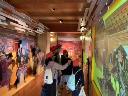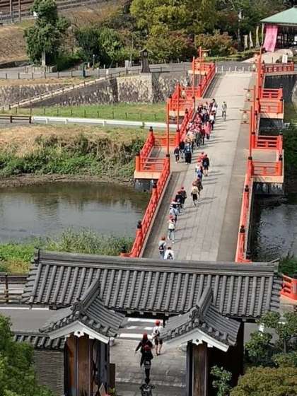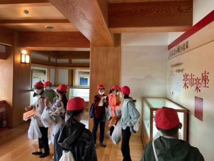 城の前の赤い橋を渡って、天守閣を目指します。城の中には、戦国時代をミニ体験できる展示もありました。