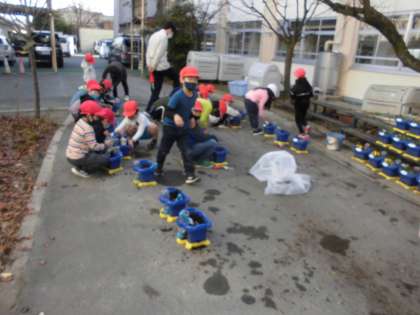 1年生は,生活科で,あさがおの栽培に使っていた鉢に,パンジーを植えました。植えた後,たくさんお水をあげました。みんなの鉢を並べると,色とりどりできれいでした。