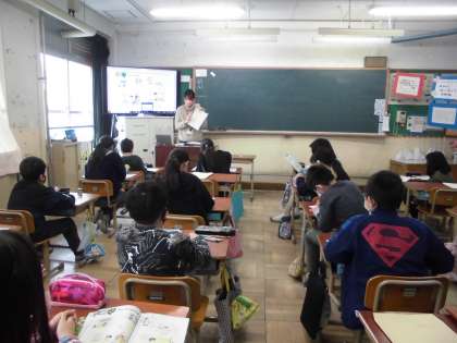 4年2組は,外国語活動で,「This is my day.」の表現について学習しました。自分自身の1日を振り返り,起きることや食べること,眠ることなどについて,表現方法を学習しました。