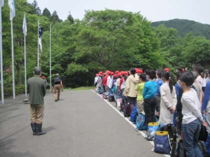 山の家に到着しました。みんな元気です。入所式で旗をあげました。