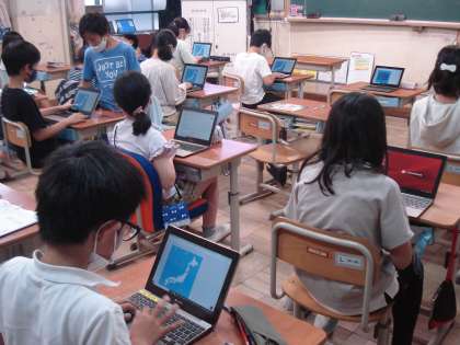4年2組は,タブレットを使って,都道府県クイズに取り組みました。地図上に浮かび上がった都道府県名をローマ字で次々に入力していきました。都道府県の場所がわかってきました。