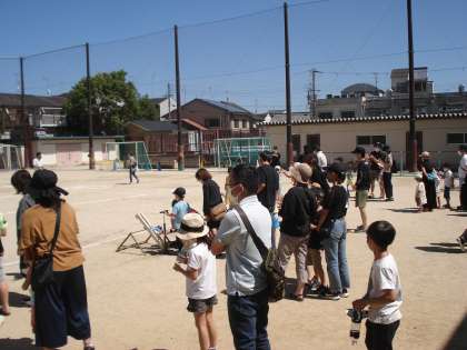 作成したペットボトルを飛ばしました。水の量を変えたり押さえ方を工夫したりしながら,飛ばしました。体育館の前から発射し,最長で総合遊具をこえる距離もでました。大きな歓声が上がっていました。楽しく活動ができました。