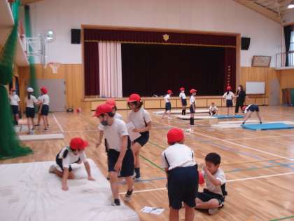 5年1組は,体育科で,マット運動に取り組みました。ねらい2では,少し頑張ればできそうな技に挑戦しました。場の設定を工夫しながら楽しく活動しました。