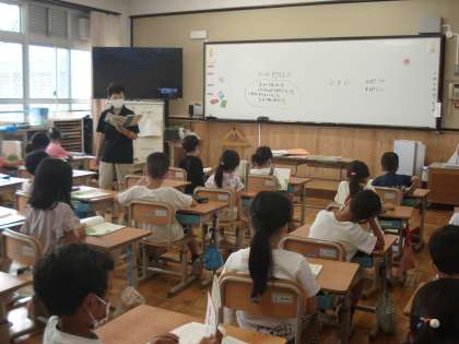 1年1組は、国語科で、「やくそく」というお話を読みました。範読を聞いて、自分の好きな場面を考えるとともに、宿題(音読)の範囲を確認しました。