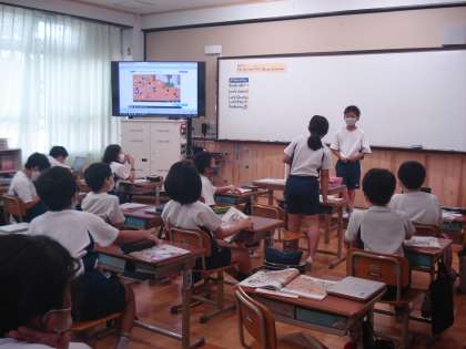 5年1組は、外国語科で、「He can ran fast.She can do kendama.」の表現を学習しました。ジェスチャーゲームを交えながら、「できること」を英語でどう表現すればよいかを学びました。楽しく学習ができました。