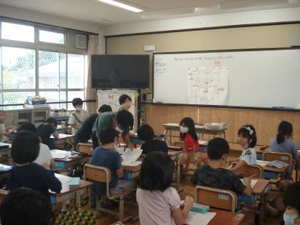 2年2組は、生活科で、生き物のすみかについて学習しました。校内のどこで、どんな生き物を発見したのかを想起し、地図上にシールで表しました。とてもたくさんの生き物がいることに気付きました。