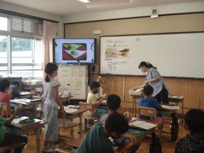 3年1組は、社会科で、京都駅でたくさん売られている人気の菓子「八つ橋」を観察しました。餡を入れたり皮を薄くしたりするなど、工夫されていることに気付きました。