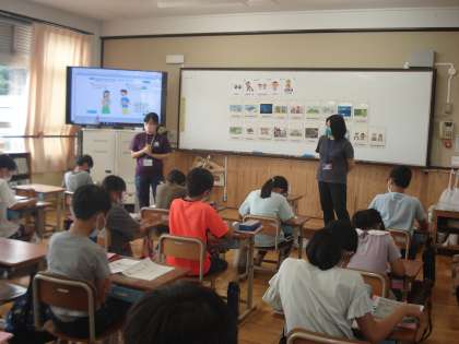 6年1組は、外国語科で、「My summer vacation」をテーマに学習しました。絵を見て何をしたのか確認した後で、英語を使って表現しました。ALTの先生の発声を参考にしました。