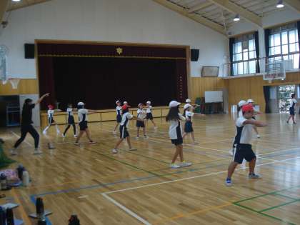 4年生は、体育科で、運動会に向けてハードル走とダンスに取り組みました。ハードル走では、「トン、サッ、サッ、サッ」のリズムで走れるよう練習しました。ダンスは、沖縄民謡に取り組みました。少しずつできるようになってきました。