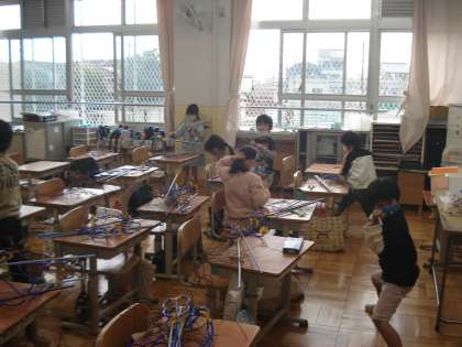 1年1組は、生活科で、育てたアサガオの弦を集めました。色や長さを確かめながら、どんなリースを作るのか考えました。また、種もたくさん拾い集めました。