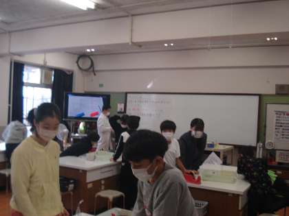 6年2組は、理科で、水溶液の性質を調べました。リトマス紙を使って、酸性・中性・アルカリ性のどれに当てはまるのか、色の変化に着目して調べました。