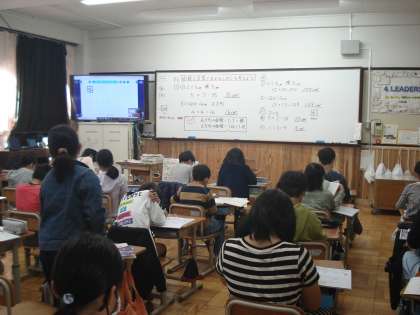4年2組は、算数科で、長方形と正方形の面積の公式について学習しました。1センチメートル四方のマスが、たてにいくつ、横にいくつ並んでいるかに着目し計算しました。