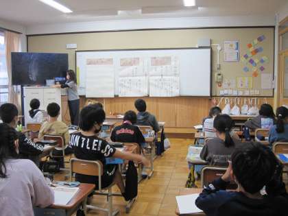 6年生は、両学級とも国語科で、「鳥獣戯画を読む」という単元の学習に取り組みました。戯画から、兎や蛙、周囲の様子を読み取ったり、筆者が、読者に何を伝えたかったのかを考えたりしました。筆者の工夫についても、読み取ることができました。