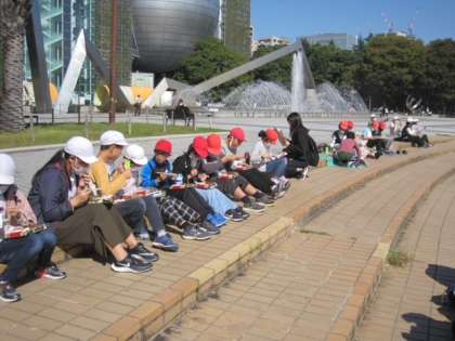 科学館に到着しました。ドームを見ながら、昼食を食べました。お弁当をしっかりたべました。時折、噴水があがりました。