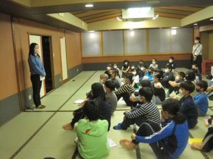 本日、最後のプログラムは「振り返りタイム」です。自分で、班で、そして全員で、1日の活動を振り返りました。明日への意欲も生まれました。この後、就寝します。皆様、お休みなさい。本日は、ありがとうございました。