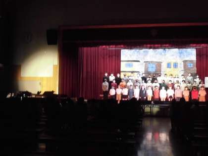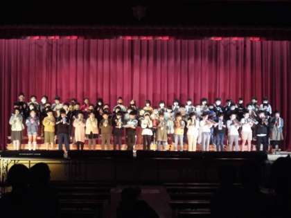 5年生は、「消えた八月」の発表を行いました。国語科「たずねびと」の学習の中で戦争について知ったことから、命の尊さについて劇として伝えました。学習して感じたことを代表の児童が伝えたり、綺麗な歌声を響かせたりもしていました。