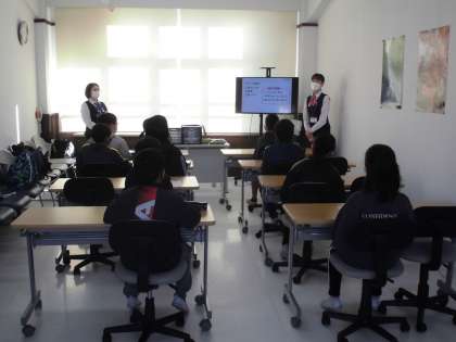 次に、企業の歴史や理念、商品や業務内容について学んだり、接客練習をしたりしました。