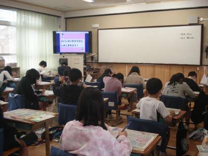 5年1組は、図画工作科で、刷った版画に着色をしました。絵の具で、紙の裏から色を塗っていきました。少し濃いめに着色することで、表には、優しく薄い色が浮かび上がってきました。