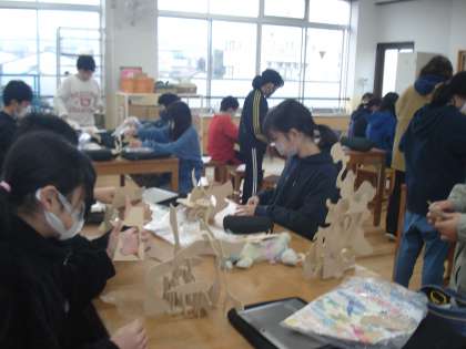 5年1組は、図画工作科で、糸のこを使って、立体作品作りに取り組みました。丁寧に切り取ったパーツを基礎材の溝に差し込んで、組み立てていきました。パーツを重ねているうちに、さらに想像が膨らんできました。