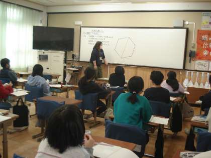 外国語科では、「道を尋ねたり答えたりするにはどのように表現すればよいか」について学習しました。交差点までまっすぐ進み、右に曲がるか左に曲がるかを表しました。ALTの先生の発音を参考に表してみました。