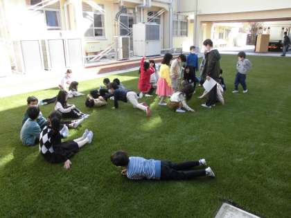 中庭では、早速、1年生が使い方のきまりなどを確認しながら、座ったり、ごろごろしたりして、楽しんでいました。人工芝の上を走ったり、ボールなどの道具を使ったりすると、怪我が起こる事例が多いようなので、ごろごろしたり、ひなたぼっこをしたりするなど「憩いの場」としていければと考えています。