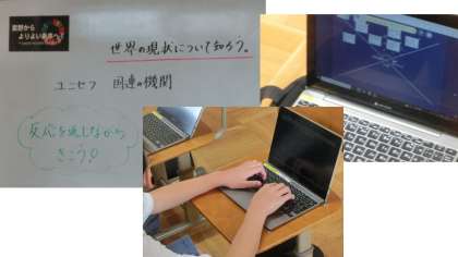 今日5月8日は、国連の機関であるユニセフの方とリモートをつないでいただき、世界の現状について知ろう、ということでお話をうかがい、学習につなげました。
