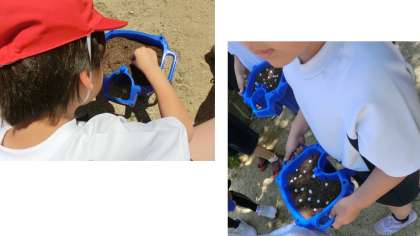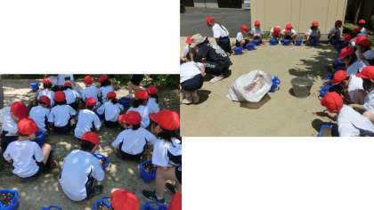 1年生はアサガオの種まきをしました。風が吹いていたので、気をつけながら慎重にまきます。少しこぼれたりと苦労をしながら種まきを終え、植木鉢を、大切にそ〜っと運びます。しっかり水やりをして、花が咲くまで楽しみに育てます。