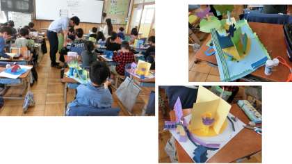 図工「くるくるランド」では、素材を生かして楽しんで工作に表現することができています。