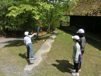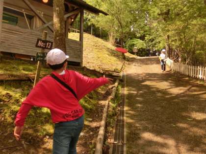 朝食のあとは、体を動かします。フライングディスクゴルフです。