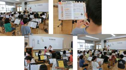 3年生の音楽です。リコーダーで「ソ」「ラ」「シ」の音を練習しています。3音でもいろいろな曲が演奏できます。また、『茶つみ』では、手遊びでリズムをとります。アルプス一万尺に似ています、という気づきの声も聞こえてきました。