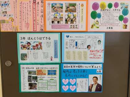 各学年が道徳等で学習した内容をまとめ、掲示しています。それぞれの学年がどんな学習をしているのか、お互いに知ることも大切です。