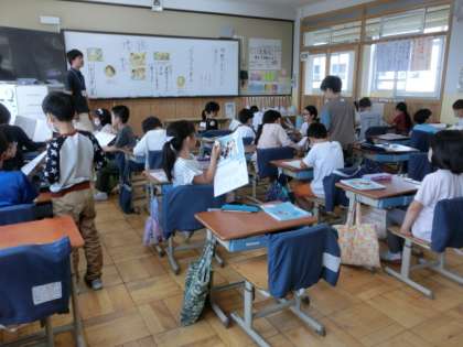 3年生は社会科で商店のはたらきについて考えています。スーパーマーケットの特徴に気づき、そこから学習問題をつくり、深めていきます。道徳では、自分の考えを友だちと交流する活動を通して、自分の考えを広げていきます。