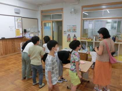 3組では、全校のお友だちとの交流をめあてに、七夕ウィークを企画・準備してきました。今日からスタートです。まずは4年生のお友だちが訪れました。短冊に願いをしたため、廊下の笹の葉かざりにはりつけます。