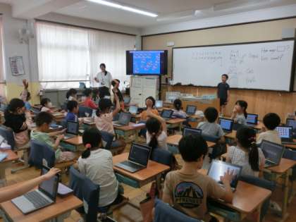 英語活動は、端末を使いながら、とても楽しく英語に触れています。お友だちの前でもにこにこと話しています。