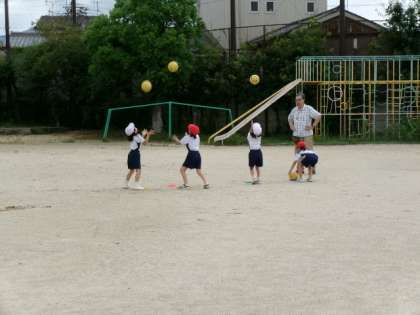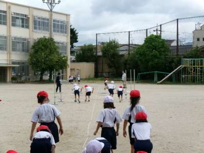 運動会に向けて、オリジナル走の練習です。まずは内容と動きに慣れます。
