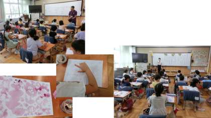 生活科では、あさがおの花をつかって色水づくりをしました。つくった色水で、和紙におもいおもいの表現をしました。