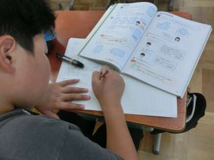 算数は「円柱の体積」の求め方を考えています。立式する際には、できるだけ計算のきまりを活用し、シンプルな計算で求められるように考えます。