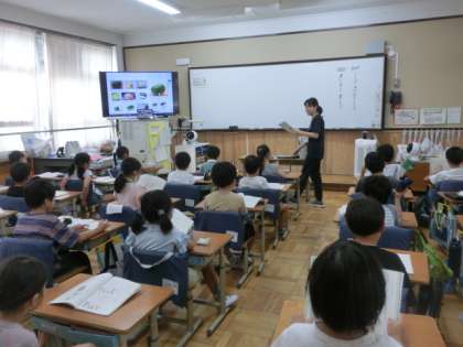 国語では、「ことばあそびをしよう」の学習で、ことばの音やリズムのよさを、声に出して楽しみます。また、「どうぶつえんのじゅうい」の気に入ったポイントや心に残った場面を、お友だちに伝えました。