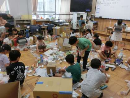 生活科「あそんで ためして くふうして」では、がらくたを「つむ」「ならべる」「ころがす」ことから発想を広げます。