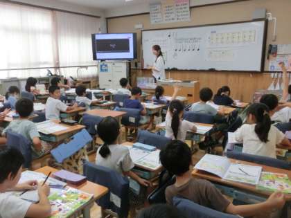 音楽科では、うたとリズムの重なりに気をつけながら、2拍子の楽曲に親しみました。リズム打ちにも工夫が見られます。