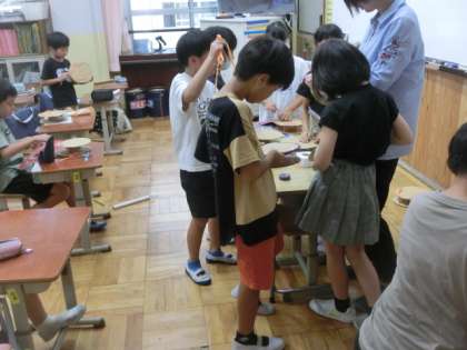 4年生は、運動会で発表するエイサーで使う太鼓「パーランクー」を作っています。自分で作って使う、ということで、気持ちも入りそうです。