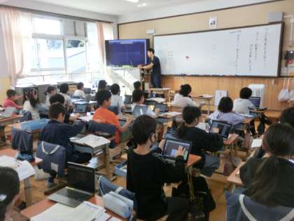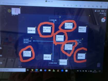 国語科では、テーマに沿ってハンデ意見をまとめる話合い活動です。思考ツールを用いて考えをまとめます。