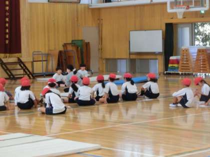 体育では、マット運動を行いました。うまく回るには、どんなことに気をつければいいかな…?