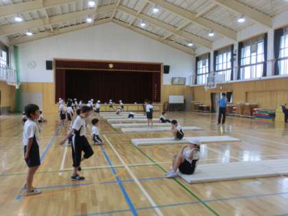 体育科ではマット運動に取り組んでいます。お友だちとアドバイスをしあいながら、練習しています。